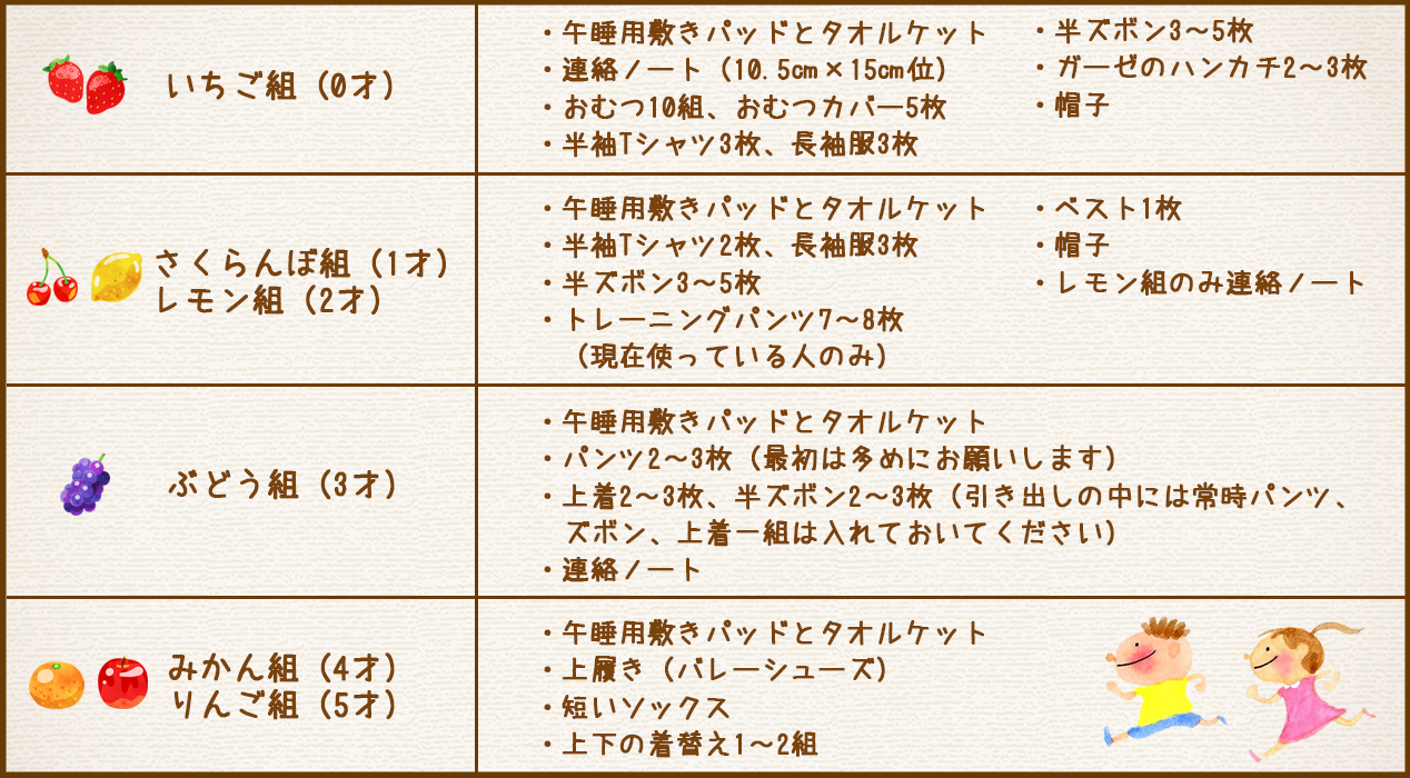 *ぶどう組(3才児クラス)に進級すると帽子、カバン、体操服の購入をお願いします。